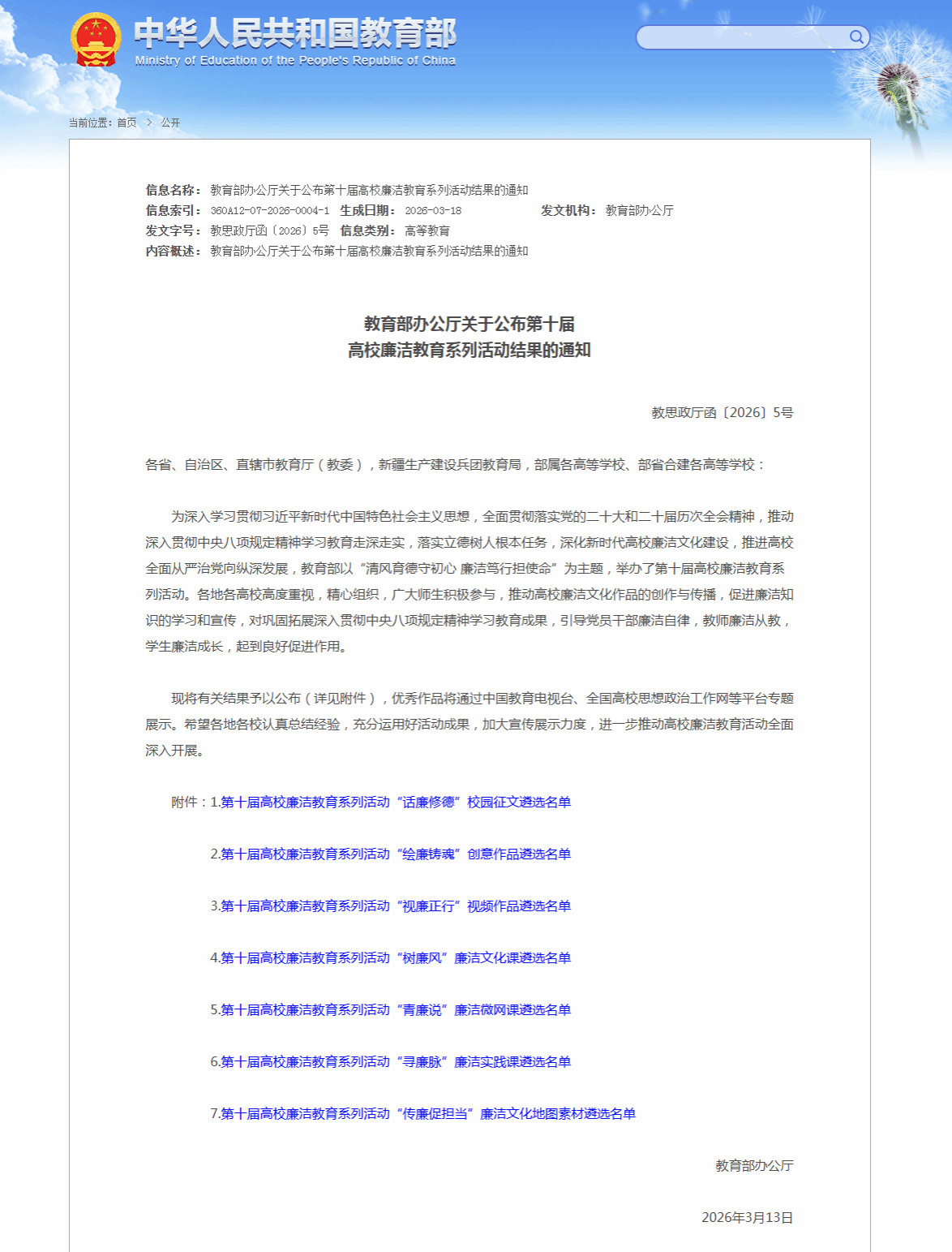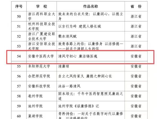 长期以来,学校高度重视学校廉洁文化建设,始终把廉洁文化建设作为落实立德树人根本任务的重要抓手,组织开展系列活动,引导师生守廉践廉,营造校园崇廉尚洁的浓厚氛围。下一步,学校将以此次作品入选为契机,进一步深挖具有“中医药味”的廉洁资源,以文化人、以廉润心,不断创新形式载体,提升廉洁教育质效,持续营造风清气正育人环境。(牛凯/文图 金晓琴/审核 陈牧/编发)