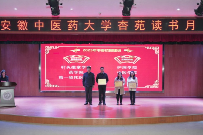 颁奖环节先后颁发了优秀阅读推广人、年度阅读之星、“当中医遇见设计”校园文创设计大赛最佳设计团队、“书香江淮·品读经典”互联网阅读大赛、第二届经典领读人大赛,以及2025年书香校园建设最佳组织奖与优秀协作奖,一度将现场氛围推向高潮。