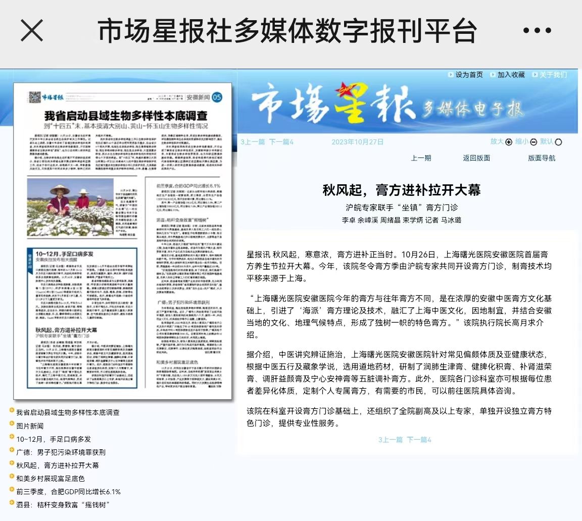 下一条:【市场星报】“秋收冬藏宜进补” 上海曙光医院安徽医院首届膏方养生节启动