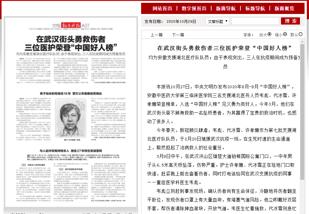 中央文明办发布2020年8月-9月“中国好人榜”,安徽中医药大学第三临床医学院三名支援湖北医务人员韦彪、代冰雪、许孝姗荣登榜单,入选“中国好人榜”见义勇为类好人。今年3月,他们在武汉街头奋不顾身救助一名坠桥患者,为其赢得了宝贵的救治时机,也感动了很多人。