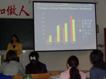 陈怡主讲“How to Prepare for the Earthquake”单元,通过大量运用视频材料,生动直观的讲解了地震的发生原因、地震前征兆、如何提前为地震做好准备等,语言生动流畅,举例丰富,师生互动热烈,收到很好的教学效果。