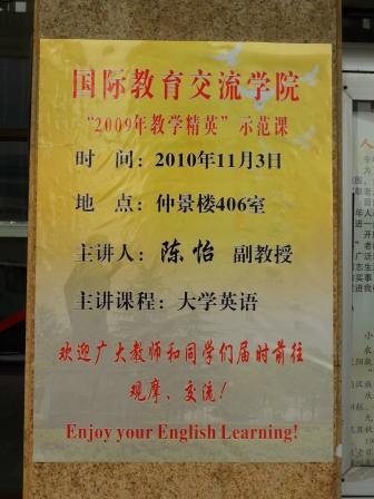 为进一步加强本科教学质量与教学改革工程建设,着力推进各种先进教学方法在大学英语教学中的应用,充分发挥教学精英等优质教学资源的示范带动作用,按照教务处有关文件要求,国际教育交流学院11月3日,举行了“2009年教学精英示范课”活动。陈怡副教授主讲大学英语课程。