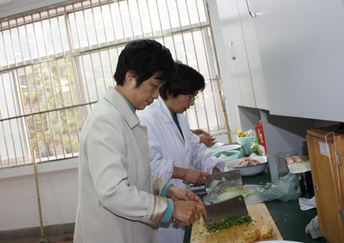 为选派代表参加学校工会举办的第三届厨艺技能大赛,11月4日下午,药学院工会组织报名的各位老师进行赛前演练和选拔,演练内容分别为10分钟包包子、土豆炒肉丝。共有10多位老师参加了本次活动。