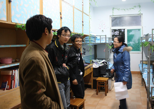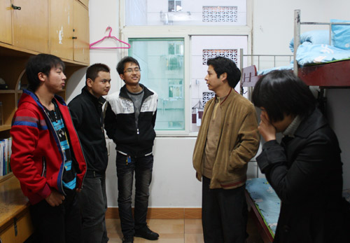 会后,张亚辉带领全体辅导员突击检查学生宿舍,他与同学们进行了亲切的交流,从中了解广大同学们的学习、生活等方面存在的问题,向同学们宣传日常生活中的安全、消防和卫生等方面的知识,希望同学们做好个人卫生,营造一个舒适的学习生活环境,积极参与学校的创先争优活动中去,做一个合格的大学生。