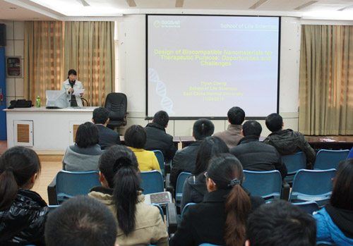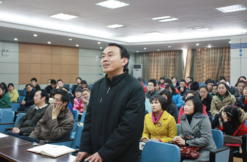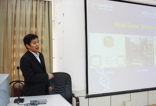 程义云主要介绍了基于治疗目的生物相容性纳米材料的设计方面的内容。他从树枝型分子在药物剂型设计中、病症诊断和治疗中、刺激响应的运输系统及智能基因控制释放系统中的应用几个方向,将最前沿、先进、深奥的研究成果生动地介绍给观众,展现了他严谨的学术精神和扎实的学术功底。随后,他与参会的教师、学生们做了深入的交流,详细解答了提出的问题。