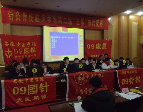12月27日针灸骨伤临床学院第二届“三基”知识竞赛在学术报告厅隆重举行,此次竞赛的参赛班级有09骨伤、09医保、09针推、09国针及09康复。该院党总支副书记翟从永、团总支书记、学生工作秘书出席此次活动并担任颁奖嘉宾。