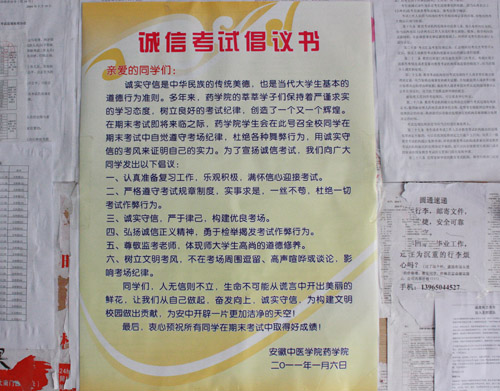 三是开展多种活动积极营造文明考试的良好氛围。诚信考试签名,诚信考试倡议书,文明考风的墙报和宣传栏。