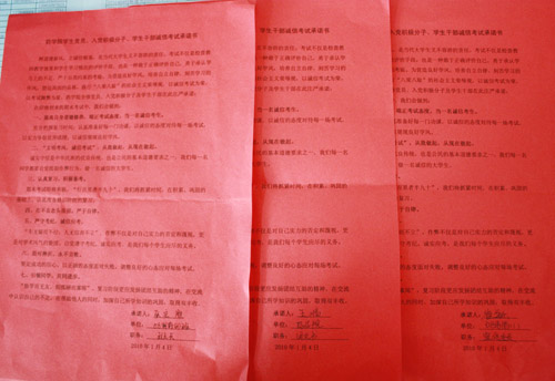 二是强化学生骨干的示范带动作用,结合创先争优,在学生党员、学生干部、入党积极分子中开展承诺活动。考试时携带承诺书,承诺做一名诚信考生,严守考纪,充分发挥了示范作用。