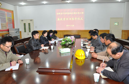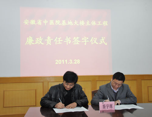 3月28日,一附院国家中医临床研究基地大楼主体工程建设廉政责任书签字仪式在小会议室举行。一附院党委副书记、纪委书记张永先与工程承建单位中天建设集团项目经理蒋超明分别代表双方在责任书上签字。中天建设集团安徽分公司经理楼军辉、医院纪委监察室、基建科负责人参加了签字仪式。