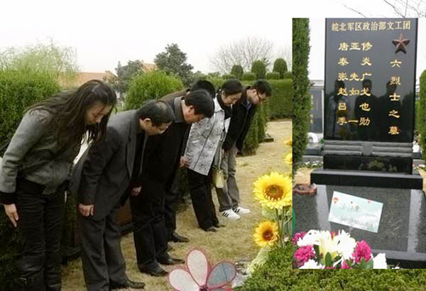 六位烈士是抗日战争时期皖北军区政治部文工团战士,因敌人破坏通行桥梁而牺牲,为纪念他们,后人将六位烈士共同安葬并立碑纪念,今年春天迁至大蜀山革命烈士墓。全体党员肃立在烈士墓前默哀,并三鞠躬,党员代表向烈士敬献鲜花。