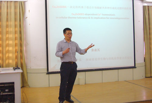 孙铁民教授和朱志兀教授分别以《以ATP合成酶为靶标的抗结核药物研究》、《Cu,Zn SOD1-决定的钙离子稳态在细胞耐热和神经退化过程中的作用》为题,孙铁民教授通过详实的图片和数据资料从抗结核药物的发展、药物的作用机制和构效关系以及目前其课题组在抗结核药物的创新设计、研究具体工作进行了详细介绍。朱志兀教授详细的介绍了Cu,Zn SOD1在细胞耐热和神经退化过程中的作用,并对相关疾病的治疗提出了积极的建议。两位教授具有创新性和前瞻性的报告,对广大师生的学术研究有很大的启发引导作用。报告会现场气氛热烈,部分老师和相关专业的研究生、本科生与两位教授进行了交流,对同学们的提问做出了详细的解答。(药化教研室 供稿)