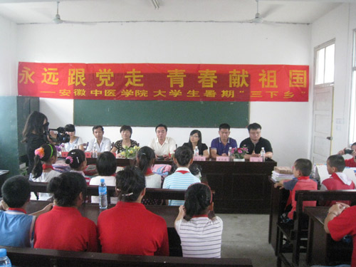 在7月15日的启动仪式上,顾义俊向柏林乡政府有关领导和当地小学生代表介绍了我校的基本情况。她强调,此次“三下乡”社会实践活动为期三天,以“永远跟党走,青春献祖国”为主题,广泛开展健康咨询和义诊活动,传播中医药科技文化,普及乡村医疗知识,增强农民保健意识。大学生志愿者要以此次活动为契机,走进田间地头,深入农村群众,向实践学习、向群众学习。在服务社会、服务群众的过程中锻炼成长,以优异的实践服务成果向建党90周年献礼。