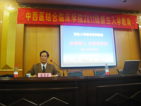 为更好的开展2011级新生入学教育,近日,中西医结合临床学院邀请该院特邀党建组织员陈昌元为2011级新生进行主题为“如何做人,如何做学问”的专题讲座。该院党总支副书记顾义俊及新生年级辅导员和180余名新生聆听了讲座,顾义俊主持了讲座。