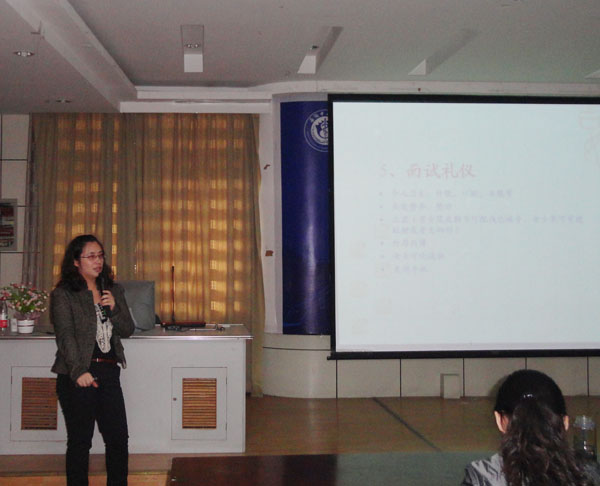 本次就业指导讲座主要针对08级应届毕业生,中国金融投资集团营运副总裁周海玲应邀就企业选贤的标准、应聘的基础要领及简历的制作等问题进行了详细的阐述与指导,同时解答了同学们有关职业规划与面试前准备工作等相关问题,周海玲强调大学生应有自信乐观,积极进取的就业态度。