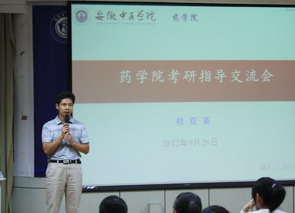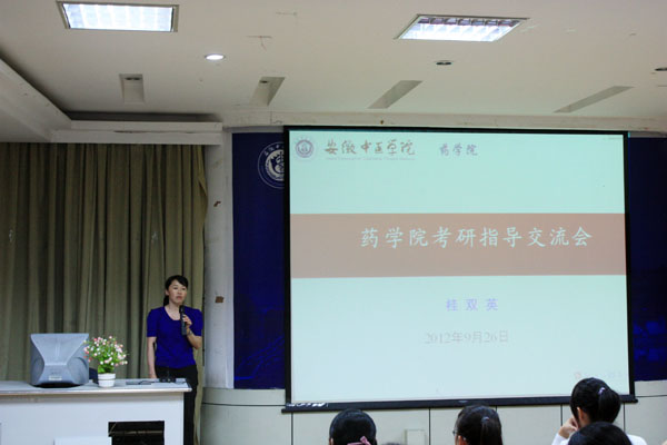 为做好2013届本科生的考研动员和准备工作,9月26日晚,药学院举行中药、药学类本科生考研指导交流会。会议由该院党总支副书记张亚辉主持,药学院副院长桂双英针对报考本校研究生做了全面系统的分析指导,来自药学院各专业的同学参加了会议。 桂双英介绍了该院中药学一级学科硕士点和药物化学、药剂学、生药学、药理学、药物分析、微生物与生化药学、药代动力学等7个药学二级学科硕士点的基本情况,重点介绍了各硕士点的特色与优势、主要研究方向、导师、联合培养单位及2013年招生计划、初试科目等情况,并祝愿考生通过努力取得良好成绩,实现自己的梦想。会上,桂双英和同学们亲切交流,就本院硕士点各个专业特点、考试经验技巧等问题一一做了解答。