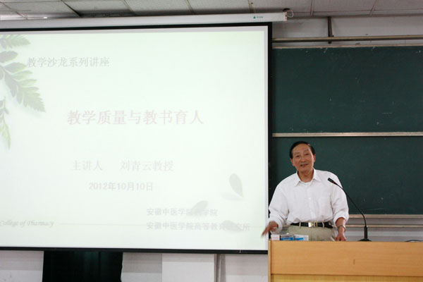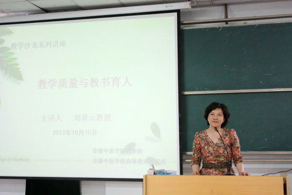 为进一步提升课堂教学效果,提高教师课堂教学水平,药学院于10月10日下午开展教学沙龙系列活动。本次教学沙龙是由药学院与高教所联合举办,邀请学校教学督导组组长刘青云教授做了“教学质量与教书育人”专题讲座。教学沙龙由该院院长戴敏主持,副院长金传山、桂双英,党总支副书记张亚辉及全体教师参加。