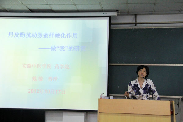 为活跃药学院科研学术氛围,促进该院院科研工作的进一步发展,10月17日下午,药学院科研学术沙龙活动如期举行,该院副院长桂双英主持,该院院长戴敏教授做的学术报告。该院副院长金传山、党总支副书记张亚辉及全体教师参加了本次科研沙龙活动。 戴敏教授以“丹皮酚抗动脉粥样硬化作用――做‘我’的研究”为题,结合她本人20余年科研工作的经历,分析作为一个科技工作者如何发现、形成适合自己发展的研究方向,畅谈坚持稳定的研究方向是科研工作可持续发展的重要保证,在科研工作中,要培养独立思考问题、独立解决问题的能力及苦中作乐的精神境界,要勤于思考、不耻下问、敢于创新、脚踏实地。