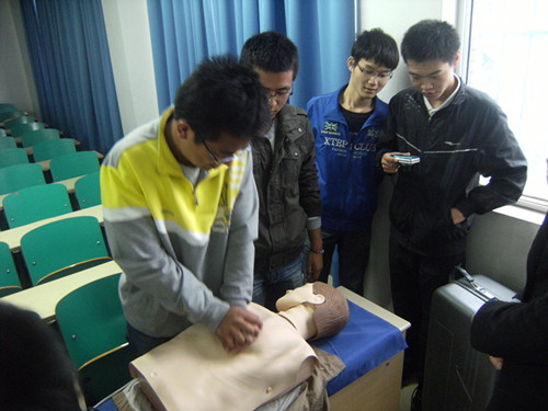 讲座开始,方海雁老师通过视频引进话题,说明急救护理在日常生活中遇到紧急事件时的重要性,介绍了在遇到紧急情况如触电、溺水、休克及心脏骤停情况下,如何进行正确的施救以确保患者的生命安全。她还通过救治原理、抢救做法和抢救过程中的注意事项,介绍了心肺复苏抢救方法,现场学生也通过人体模型现场进行了心肺复苏操作,方老师就操作中存在的问题进行了耐心的指导。