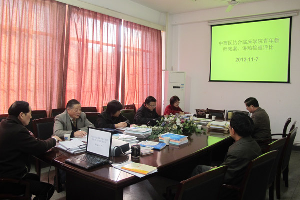 为了进一步加强教师师资队伍建设和青年教师的培养,调动青年教师钻研业务的积极性和主动性,迎接校青年教师教学基本功大赛,11月7日下午,中西医结合临床学院邀请校督导刘青云、王元勋、徐麟、陈雪功、梁文珍及高等教育研究所所长韩茹对该院青年教师教案讲稿进行检查评比。