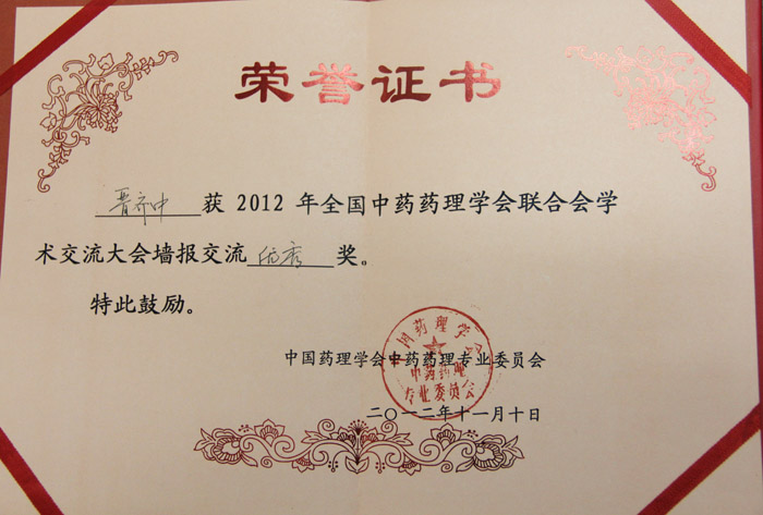 11月9至11日,由中国药理学会中药药理专业委员会、世界中医药联合会中药药理专业委员会、中华中医药学会中药实验药理分会联合主办、南京中医药大学承办的全国中药药理学会联合学术交流大会在南京举行。药学院汪宁老师带领研究生同学参加了本次学术交流会,晋齐中同学获得墙报优秀交流奖。
