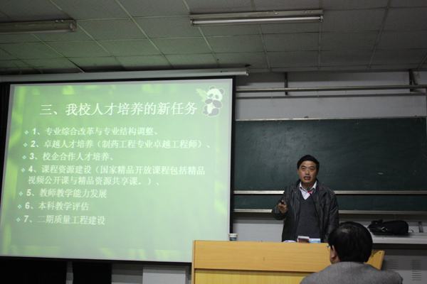 为提升教师教学能力,促进教学改革,进一步完善药学院质量工程建设,11月21日下午,药学院与高教所联合举办教学沙龙。活动邀请学校教务处处长储全根教授作了“人才培养面临的形势与任务”专题讲座。该院副院长金传山主持沙龙,书记吴达武、副院长桂双英、副书记张亚辉及全体教师参加。