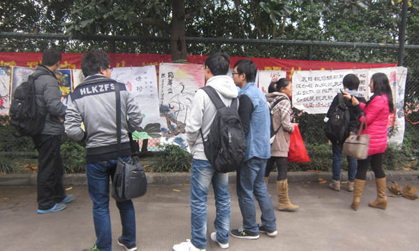 11月26-27日东区食堂附近的林荫道旁,人潮涌动,校学生会学习宣传部在这里举办的“青春献礼十八大”新生主题书画大赛作品展吸引了大批同学。