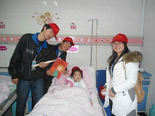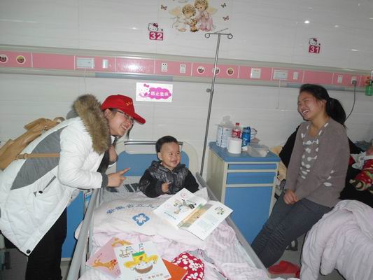 志愿者们刚到达儿童医院,就急忙赶到阅读坊,精心挑选了孩子们爱看的图书。接到分配的楼层和科室后,志愿者们就兴高采烈地捧着书前往病房,孩子们兴奋地瞪着那些花花绿绿的图书,等待大哥哥大姐姐们讲给自己听。志愿者们绘声绘色的讲述,配合手势和表情,孩子们在收获快乐的同时也学到了不少课外生活知识。当孩子们阅读累了,志愿者们就陪他们玩游戏,坐飞车,唱儿歌,整个病房里其乐融融,连楼道里都回响着咯咯的笑声。