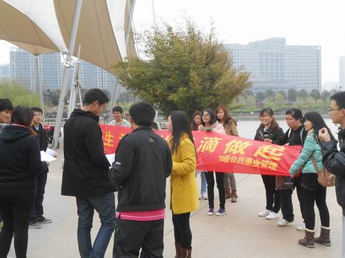 11级公共事业管理团支部在合肥天鹅湖举行了“宣传低碳环保,共建绿色城市”的雷锋活动,活动中,通过向行人分发有关“低碳环保”内容的宣传单,提醒人们绿色城市的构建,不仅是政府及相关部门的事情,作为普通民众也要参与进来,为建造美丽绿色合肥而共同努力。