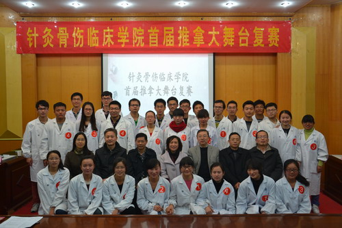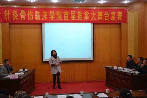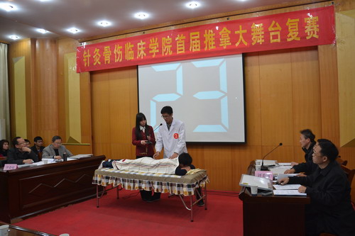12月4日下午,针灸骨伤临床学院在梅山路校区图书馆学术报告厅举办首届推拿大舞台复赛。比赛特邀校附属中西医结合医院院长何光远,第一附属医院针推科副主任吕子萌,第二附属医院推拿科主任蒋涛,该院康复教研室主任陈朝晖以及推拿基础教研室副主任姚长风担任评委。该院院长胡玲、副院长唐巍出席活动,该院各班级辅导员、各参赛班级同学以及2013级新生代表观摩了比赛。