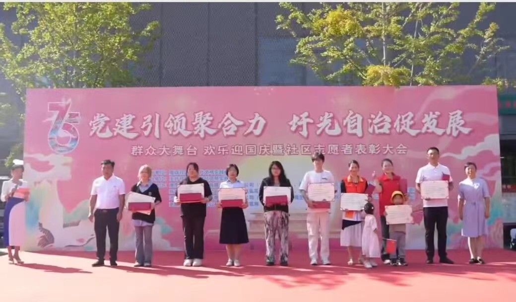 为庆祝中华人民共和国成立75周年,大力弘扬志愿者服务精神,9月28日,磨店社区王圩社居委等单位举办了“欢乐迎国庆文艺暨社区志愿者表彰大会”。医药信息工程学院志愿者服务队在此次活动中受到表彰。