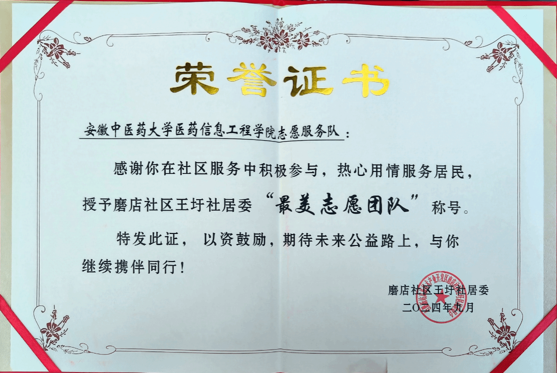 此次活动,不仅表彰了过去一年里在社区服务中无私奉献,表现出色的志愿者团队,同时也借助浓厚的国庆氛围,弘扬志愿者服务精神,激励更多的人们积极参与到志愿者行动当中。在表彰大会前,医药信息工程学院学子热情细心地服务居民,团队被磨店社区王圩社居委授予“最美志愿团队”。(蔡鹏程、吴则孔/文 新媒体中心/图 高霞/审核)