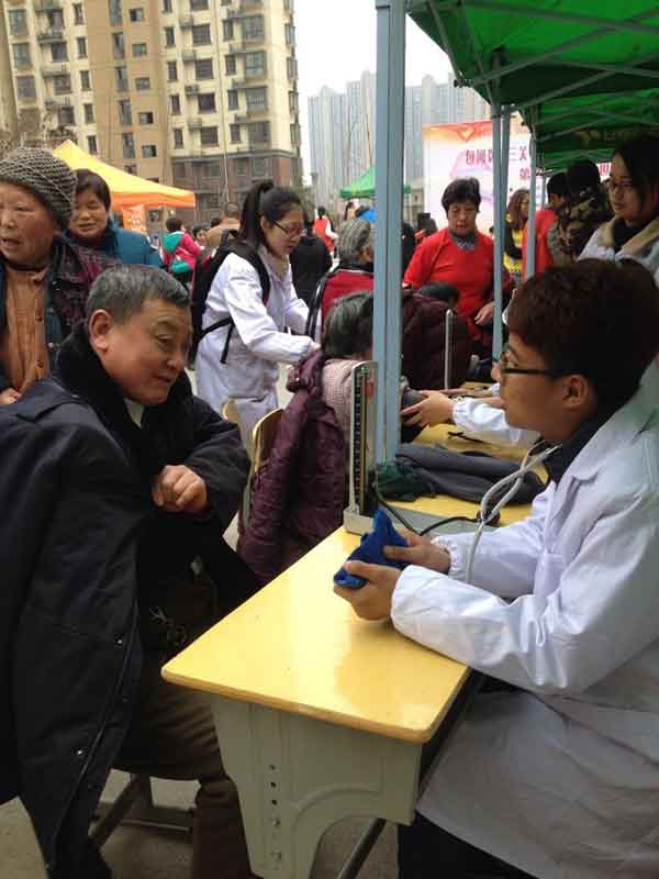大学生志愿者与包河区义工团的志愿者一起为包河区和园社区的居民量血压,开展健康知识宣传并接受健康咨询。