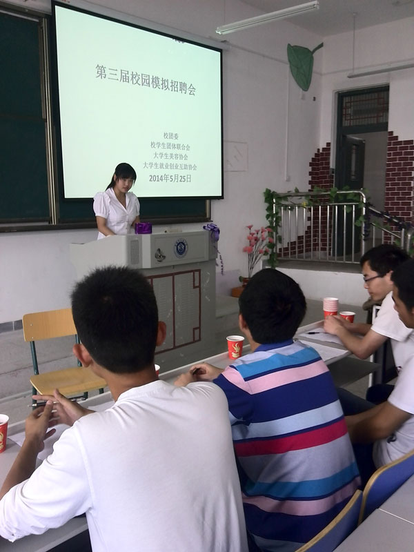 为给广大同学提供一个近距离接触招聘现场和展现自我的平台,全面了解招聘的相关知识、技巧,5月25日晚,由校团委,校学生团体联合会主办,大学生美容协会,大学生就业创业互助协会承办的第三届模拟招聘会在少荃湖校区举行。