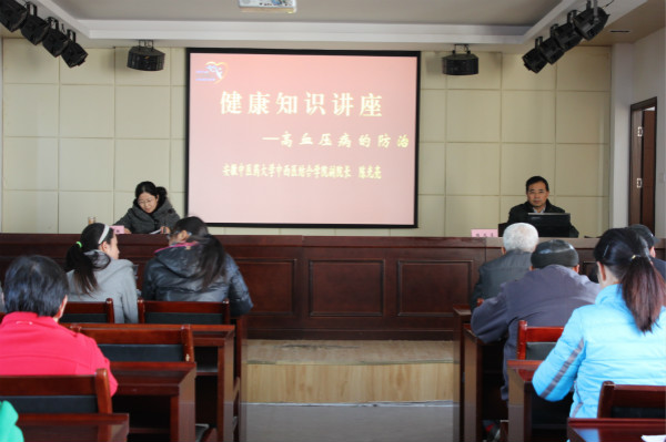 12月5日下午,中西医结合临床学院成立第二届大学生健康知识宣讲团,在中西医结合临床学院副院长、大学生健康知识宣讲团主要指导老师陈光亮教授的带领下,走进合肥市蜀山区西园街道,在西园街道会议室作题为《原发性高血压的防治》的专题讲座。西园街道领导、大学生健康知识宣讲团部分成员及近百位居民听了本次讲座。