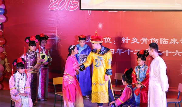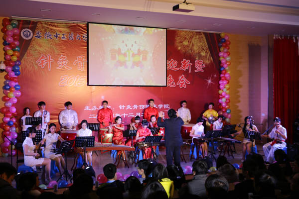 针灸骨伤临床学院党总书记杜明做新年致辞,总结2014年学院成果,对老师学生的努力表示感谢,同时憧憬2015年的发展,对学生提出志存高远、培养崇高品德等新年希望。晚会节目种类丰富,精彩纷呈,相声表演、舞台剧和朗诵贴近学院特色;深情独唱《时间都去哪儿了》结合沙画把观众带回童年,催人泪下;中西合璧的英语话剧《甄�传》推陈出新。现场特设微博大屏幕,“晚会好精彩!”“加油!”等词语层出不穷,同学们纷纷发布自己的感想。民族舞《欢乐舞曲》以优美的舞姿点燃了全场的气氛,成为全场的亮点,也标志了本次晚会落下帷幕。