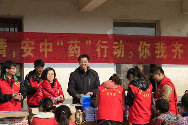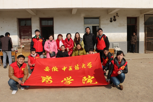 知识启迪梦想,爱心孕育希望。安徽中医药大学药学院“情系大陆小学留守儿童爱心捐赠活动”经过近一个月的筹备,于2014年12月24日在大陆小学操场举行。在药学院党总支副书记金晓琴老师、药学院团总支书记陶曜天老师的带领下,由药学院学生会志愿者代表组成的一行人,以及合肥市志愿者代表一同奔赴肥东县古城镇大陆小学,为学生们带去学习和过冬物资。