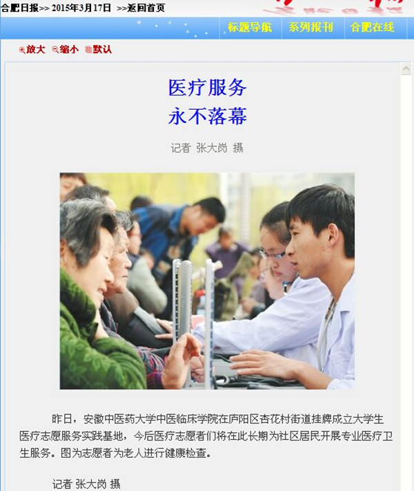 授牌仪式之后,学生志愿者们为金都社区居民们开展了一场爱心义诊活动。并向居民介绍春季养生保健知识。志愿服务队受到了居民们的热情欢迎与夸赞。《合肥日报》对此次活动进行了详细报道。(徐慧/文图)