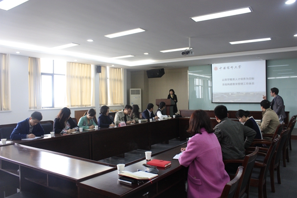 中国药科大学药学院朱红书记从学校历史、辅导员队伍建设、党员的管理、生源基地的建设等方面进行了详细的介绍。安徽中医药大学药学院副书记金晓琴就学校、学院基本情况、新生入学教育、心理健康教育、毕业生就业指导等我院特色学生工作进行了交流。两校的辅导员还针对学院党团建设、学生活动的开展、学生管理和日常工作等方面展开了深入的讨论。中国药科大学药学院的学生工作,很多方面值得我们借鉴和学习。在党团建设中,建立党员工作室,积极促进党建带动团建,发挥党员的模范带头作用。针对目前学生活动过多的现状,学院学生活动的开展坚持“少而精,树品牌”的基本原则,结合学院特色,梳理品牌活动。学生管理和日常工作方面,“揽全局,抓重点”,设立辅导员助理岗位,辅导员统筹完成各项工作。