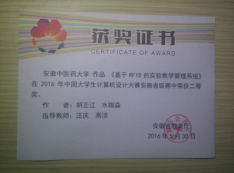 医药信息工程学院参赛作品《基于RFID的实验教学管理系统》(参赛学生:13医软2班-胡正江、水�淼,指导老师:汪庆、高洁)获得本科组“软件服务外包类”项目二等奖,并被推荐参加8月份在东南大学举办的国赛。