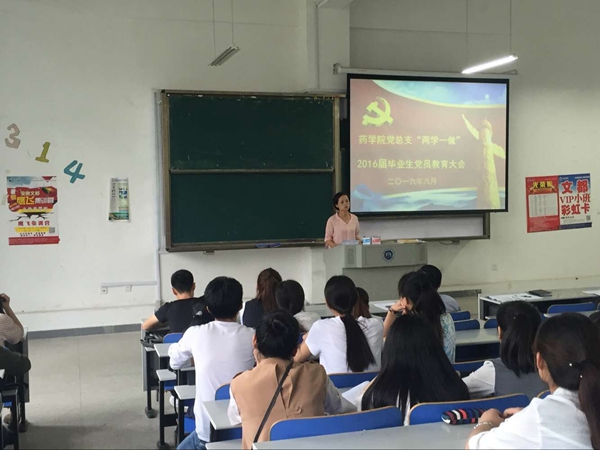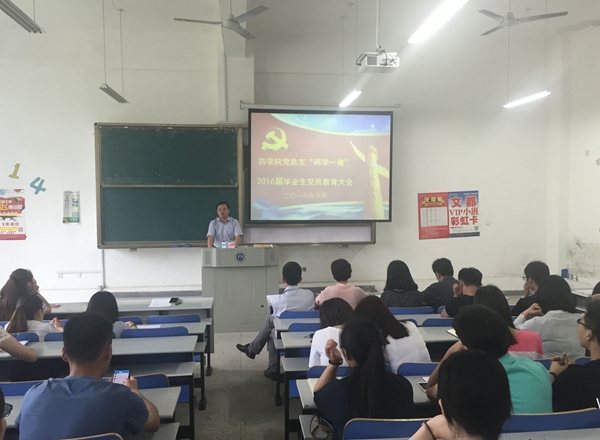 为深入开展“两学一做”学习教育,加强毕业生教育,做好2016届毕业生党员离校前的有关工作,激励毕业生党员在工作岗位上充分发挥党员先锋模范作用。6月8日下午,药学院党总支于少荃湖校区A112教室隆重召开2016届毕业生党员教育大会。学院党总支书记吴达武、副书记金晓琴出席会议,各学生党支部书记、毕业班辅导员及2016届全体103名毕业生党员参加会议,会议由任亚硕主持。