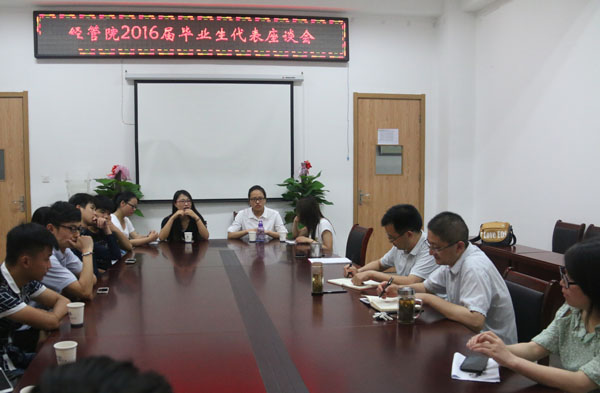 6月22日,经管学院召开欢送2016届毕业生座谈会。学院党总支副书记黄学武,副院长丰志培,辅导员方悦与学院毕业生代表欢聚一堂,依依话别,共叙情谊。