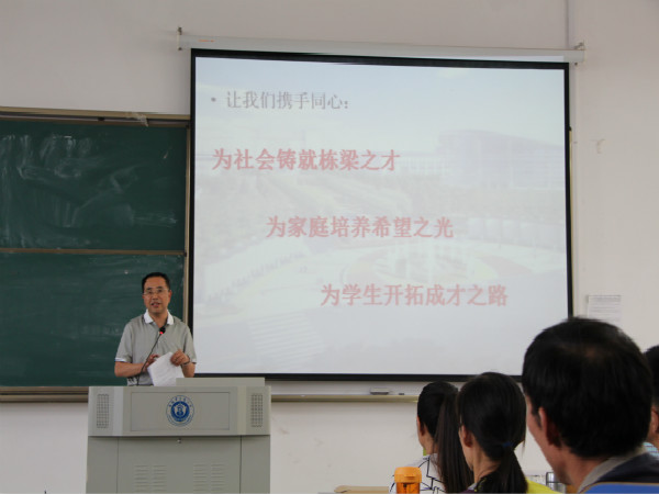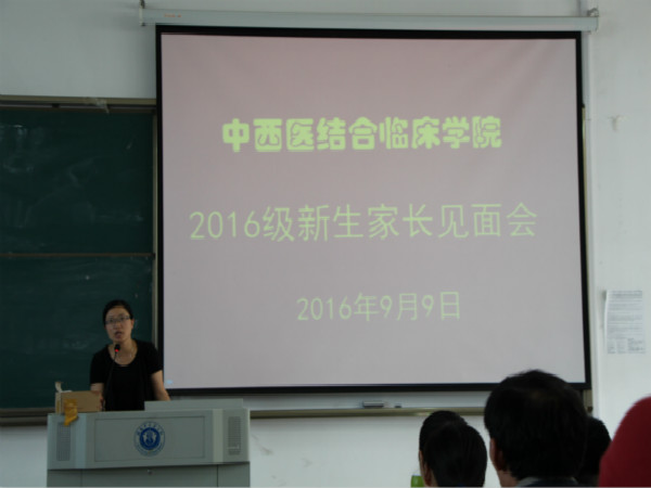 9月9日下午,中西医结合结合临床学院迎来了2016级近360名新生,学院为做好与家长的对接,更好的服务新生,让学生安心、舒心的开始大学生活。该院2016级新生家长见面会在少荃湖校区B419教室举行,该院党政领导班子出席见面会,该院新生辅导员及近200名家长及新生到会。 该院党总支书记吴成长致欢迎辞,代表学院感谢广大考生及家长对学校和学院的信任和支持,并向广大新生和家长的到来表示诚挚的祝贺。会上,吴成长做了“不为选择,更为热爱,我的中西医结合”主题讲座,讲座围绕“坚定中西医结合理念,弘扬中西医结合精神”着重介绍中西结合的内涵、名人名家、该院优秀的学生群体和丰富的校园文化。吴成长寄语新生及家长,携手同心:为社会铸就栋梁之才,为家庭培养希望之光,为学生开拓成才之路。