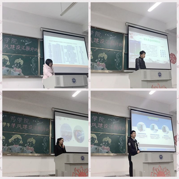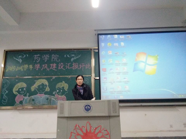 12月6日晚,药学院在少荃湖校区B326教室举办2015-2016学年学风建设汇报评比活动,总结各班2015-2016学年开展的学风建设专项活动成效,查找问题和不足。校学生处处长王红松、副处长冯祥,药学院党政领导和全体辅导员出席此次活动,并对所有班级的汇报进行评分。各年级班委参加汇报会。