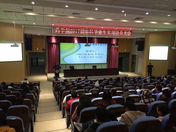 为做好本科毕业生实习工作,药学院于12月12日晚在少荃湖校区召开2017届本科毕业实习动员大会。药学院副院长桂双英、毕业班辅导员以及2017届本科毕业班全体学生参加了会议,党总支副书记金晓琴主持会议。