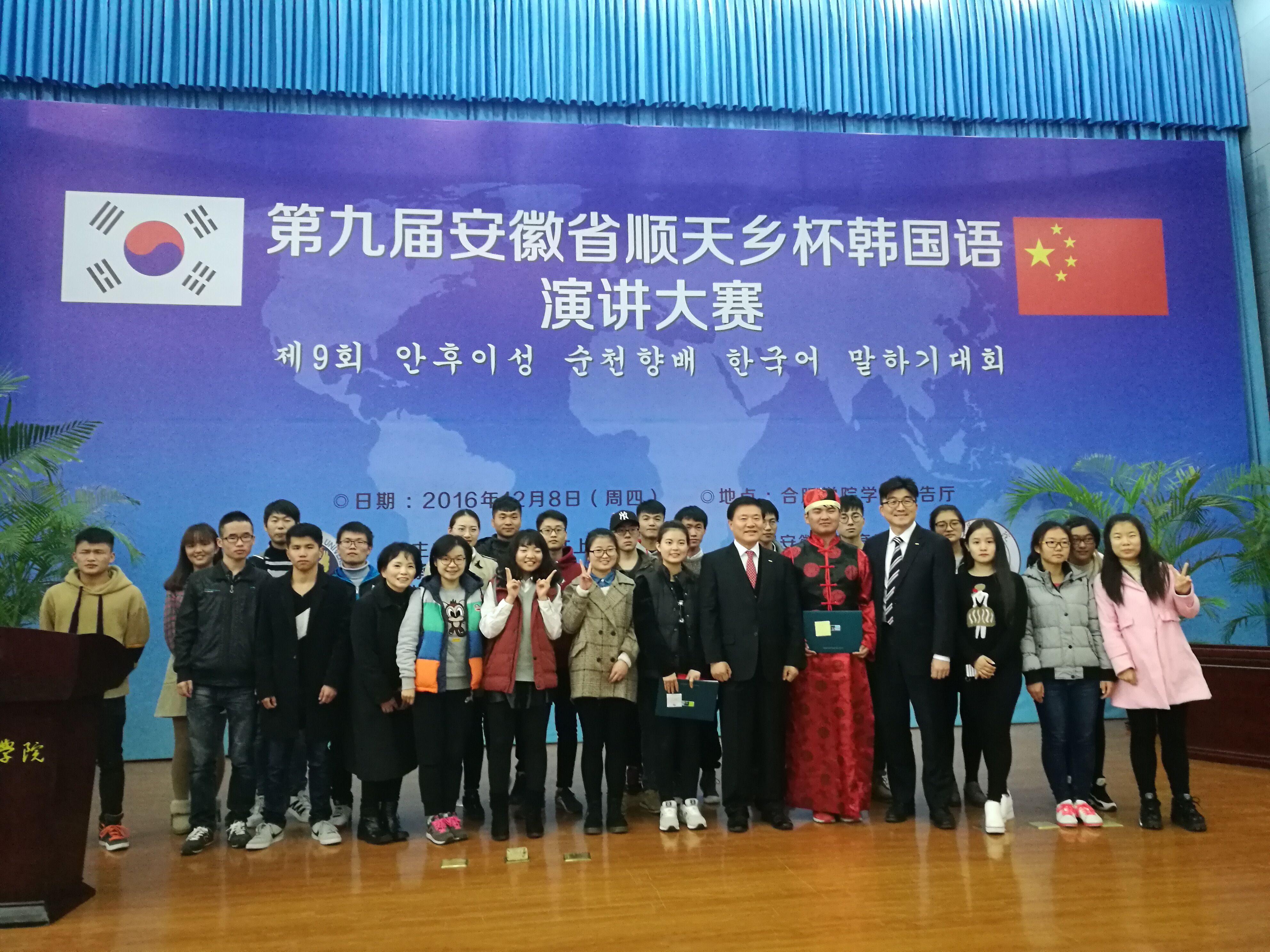 12月8日。一年一届的“安徽省顺天乡杯韩国语演讲大赛”在合肥学院如期举行。我校医药信息工程学院15届计算机涉外班的刘硕和王晨艳同学表现优异,分别获得二等奖、三等奖。