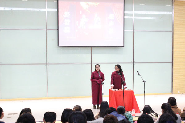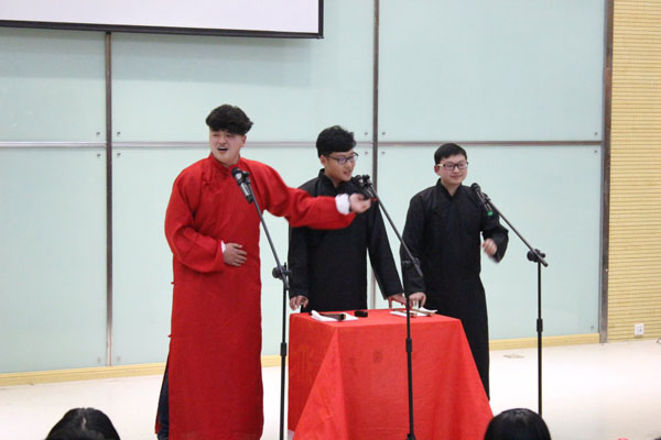一段节奏欢快的快板表演拉开了晚会序幕,全体相声社成员的开场小唱则吊足了观众胃口。两名女同学的对口相声《电视情缘》,使大家捧腹大笑,群口相声《扒大褂》,同学们演出卖力,获得阵阵掌声,单口相声《雨夜凶宅》给大家带来一段“笑不出”的相声体验。