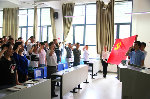 首先,学生第二党支部书记孟南作为领誓人带领全体与会党员共同重温入党誓词。之后,13级药物制剂二班王洁作为学生党员代表讲话,回忆了大学四年精彩而丰富的学习生活,代表全体毕业生党员表达了对母校、学院和老师的衷心感谢和深深祝福,倡议所有毕业生党员同学在毕业季离校活动中做好表率,站好最后一班岗。