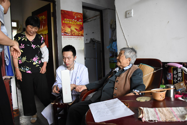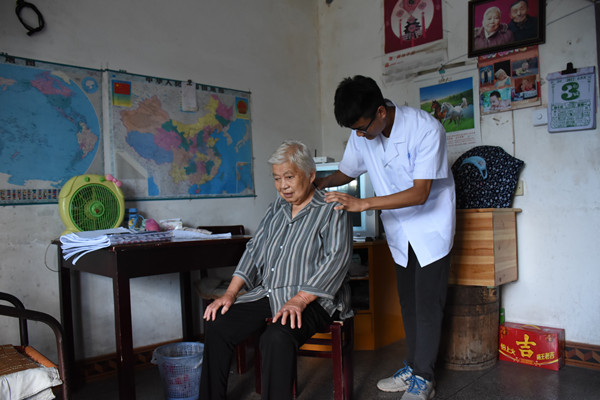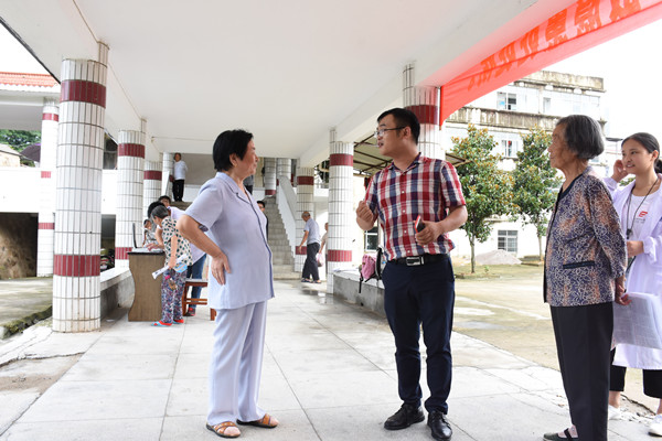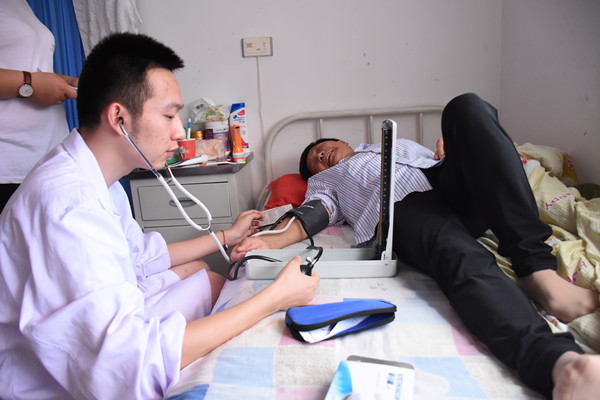 3日下午,服务团赶赴太湖县老年公寓,为老人们送医送温暖。实践活动按计划分组进行,一组前往老年公寓宿舍,与高寿老人促膝交流,在交谈中完善调研活动,深入了解当地老人对中医药知识和心血管疾病信息的知晓度和治疗率。同时为宿舍内老人测量血压和进行简单的医疗问询,并分发养生宣传单页和校报,增进老年人对医药知识和本校的了解。另一组搭建室外体检点,在老年公寓室外为来往老人进行量血压、穴位按摩等医疗服务。其余成员与老人们聊天谈心,在交流中改善老人心情,全面提升老年人的身心健康状况。