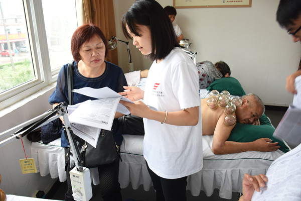 7月3日上午,团队抵达太湖县新城社区医疗服务中心,开展一系列社会实践活动。活动开始前,中心李主任给爱心服务队热情介绍服务中心的基础设施、服务范围和发展方向等基本信息,帮助同学们尽快熟悉环境。之后,服务团深入中心病房,观摩学习新型针灸推拿技术,同时实践平日课堂所学,在医师指导下为患者提供特色拔火罐服务。此外,宣传中医药养生知识和调查当地常见病的研究工作同步进行。在当地群众的热心合作下,调研及宣传工作进展顺利。之后,中心医护人员介绍当地特色疗法“葫芦灸”,拓展成员医疗视野。其间,针推科张主任与成员亲切交谈,讲述自身行医经历,浅谈中医药事业未来发展良势,增进成员专业自信。团队成员在此次社会实践中获益匪浅,为中医药事业发展做贡献的信念更加坚定。