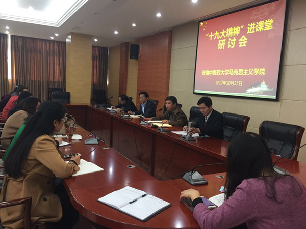 10月25日上午,马克思主义学院“十九大精神进课堂”研讨会在东区新安楼会议室举行。与会老师就思政课各门课程如何渗透十九大精神、如何贯彻落实十九大精神进行了深入研讨。会议由学院党总支书记胡卿主持。
